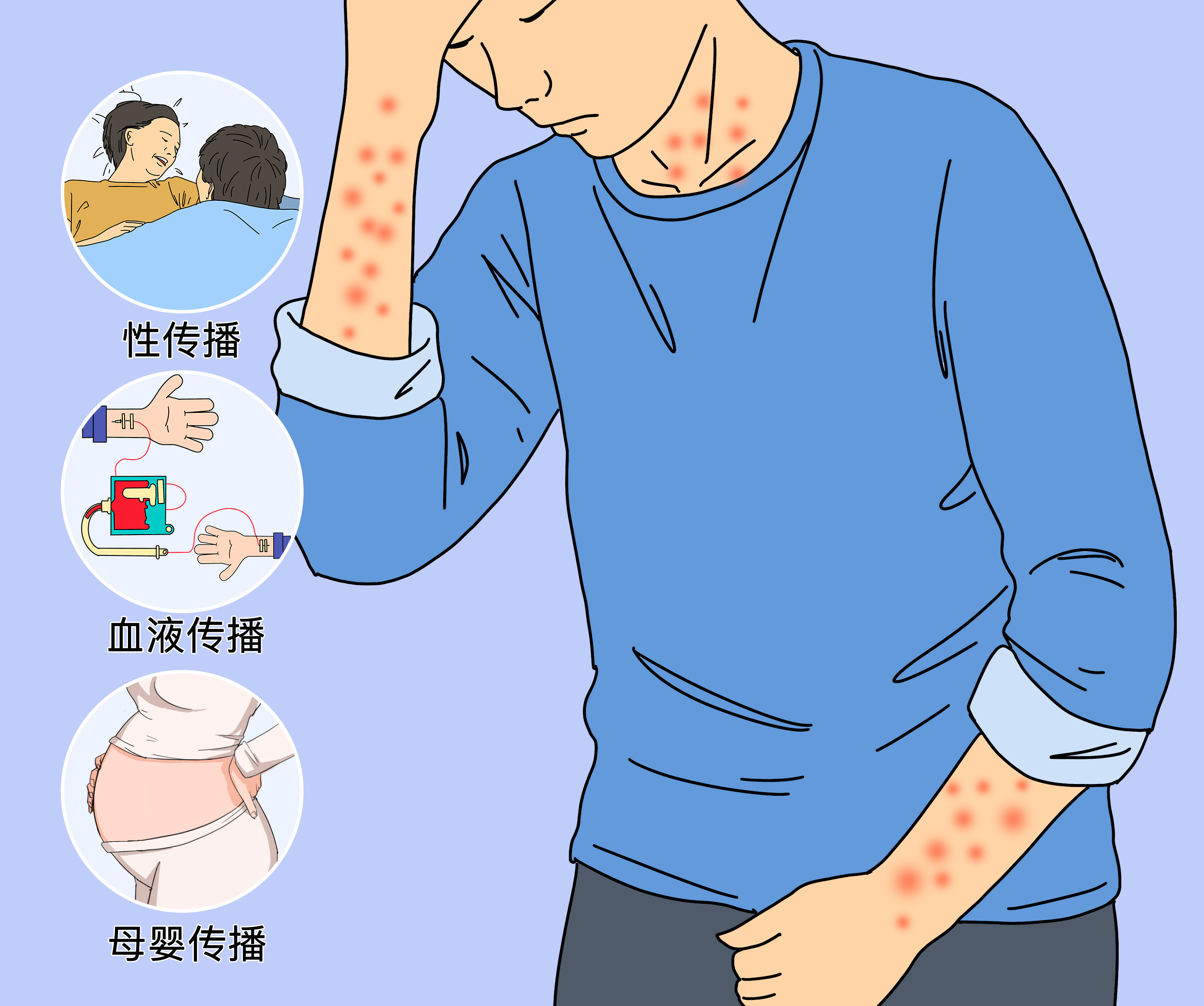 艾滋病风险:梅毒患者感染艾滋病的概率比普通人高2-5倍。这是因为皮肤溃烂出血时,病毒更容易通过伤口进入血液;