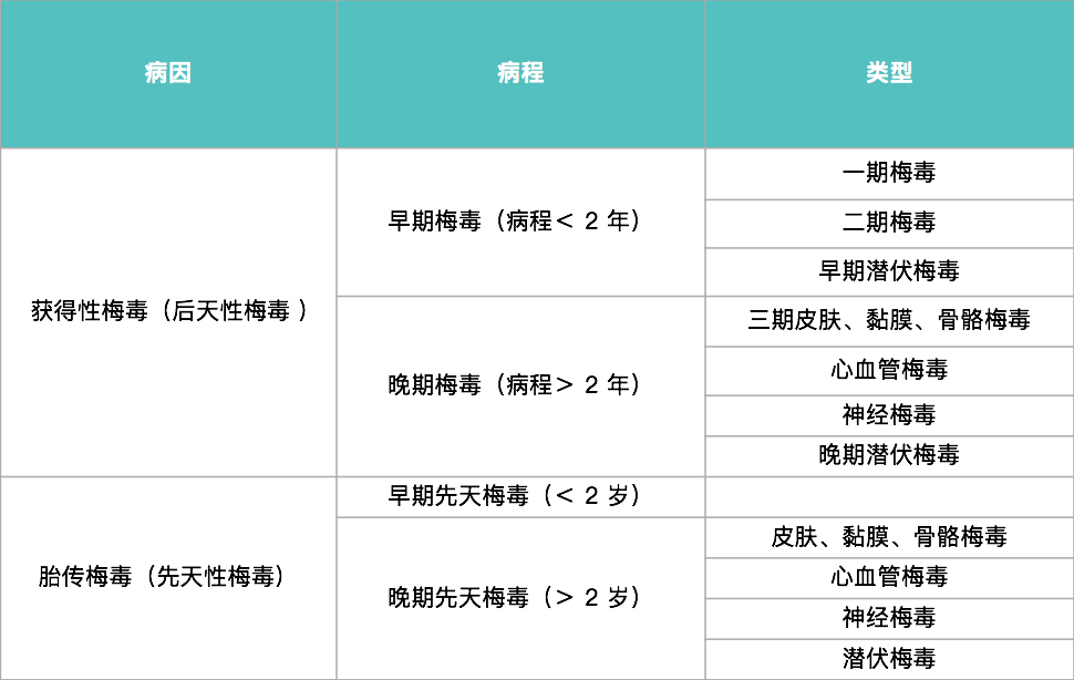 梅毒主要分两大类:后天感染的叫获得性梅毒,妈妈传给宝宝的叫胎传梅毒。根据发病时间不同,又可以分为早期(感染两年内)和晚期(超过两年)两种类型。