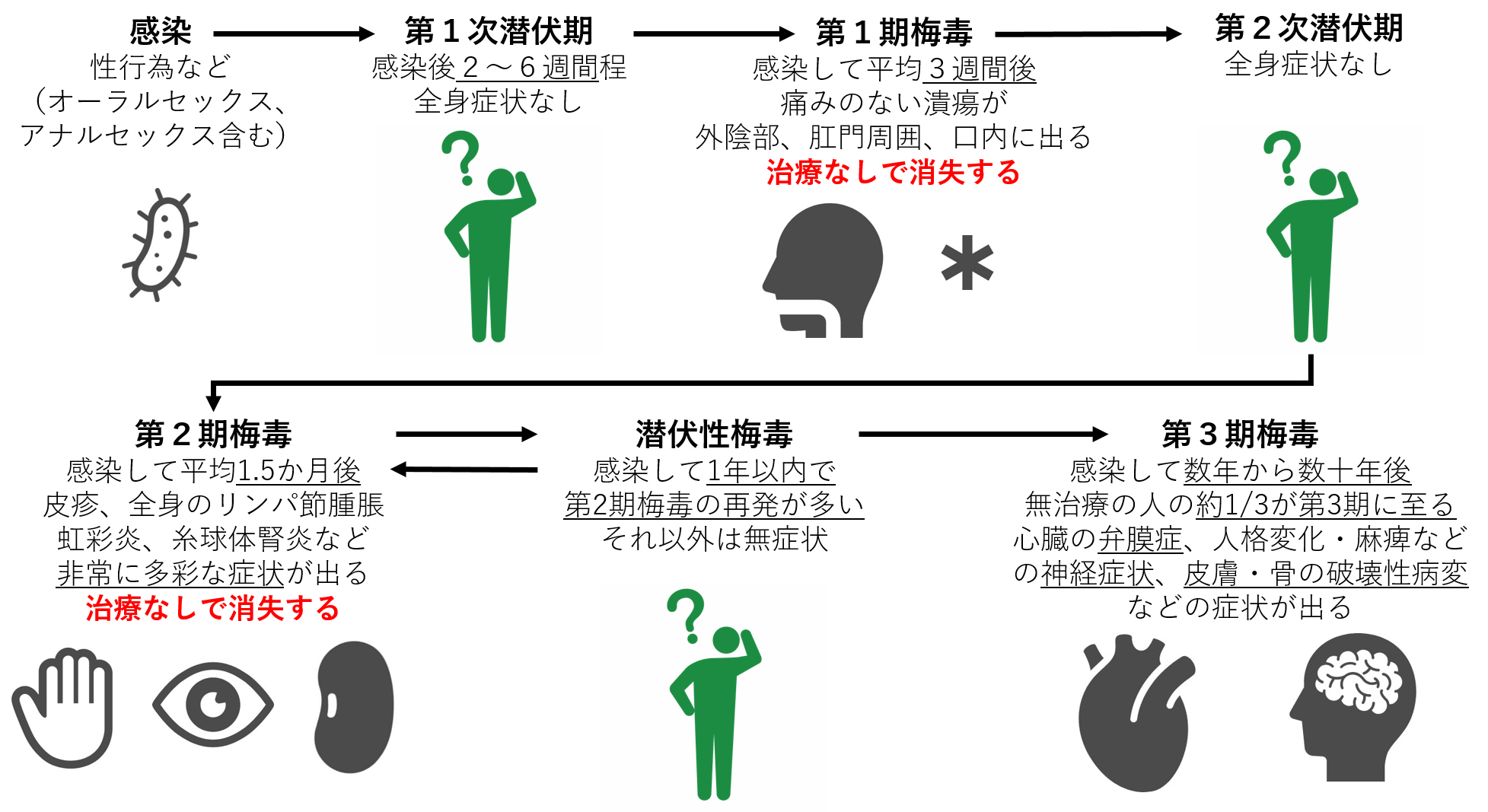如果不治疗,疾病会进入潜伏期(表面无症状的隐藏阶段)。当身体免疫力下降时可能复发,或数年后发展为破坏性最大的三期梅毒。